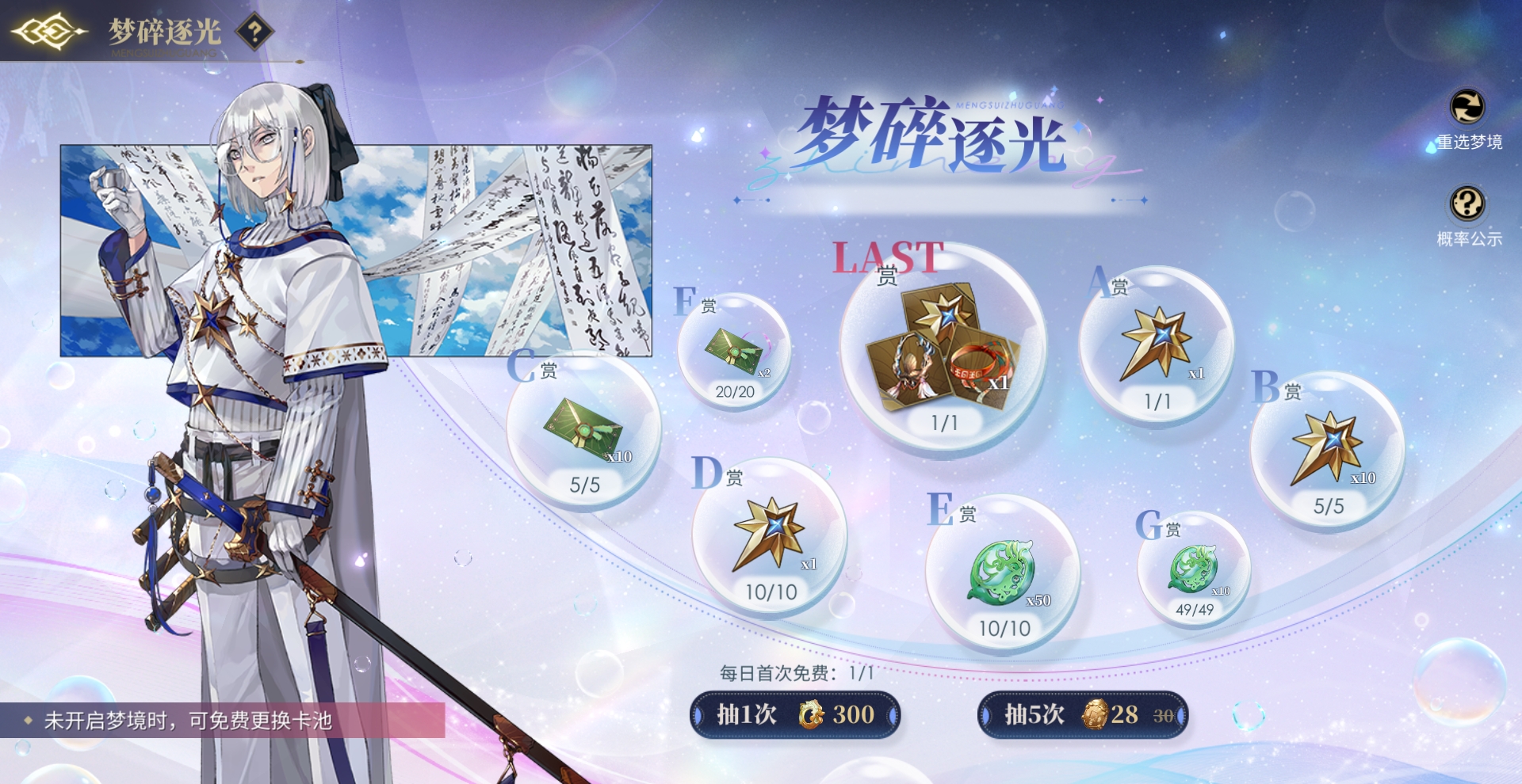 活动期间龙子大人可通过主界面左下角活动按钮进入「梦碎逐光」活动页面。并选择一个梦境作为自己的参与主题(可通过页面中右上角“重选梦境”按钮随时更换重置),参与活动有机会「镜灵专属藏品」、「镜灵专属藏品碎片」、「藏品升级道具」等级奖励。
